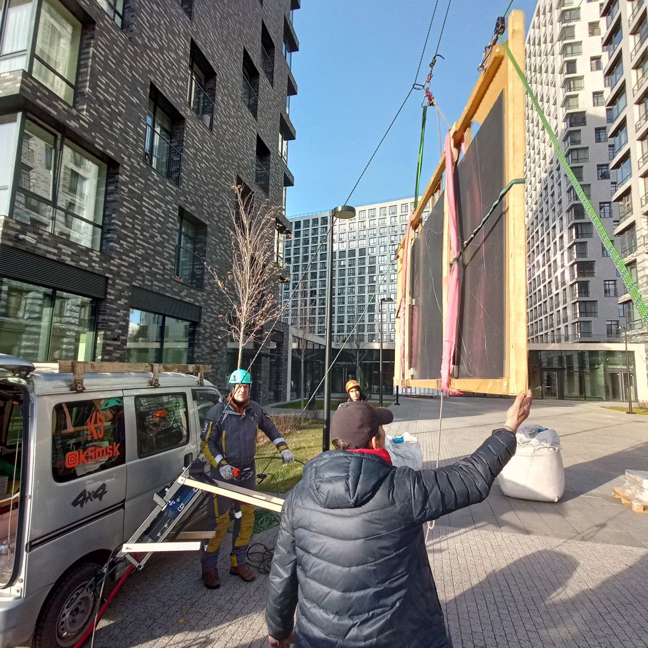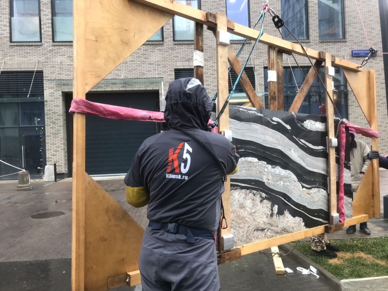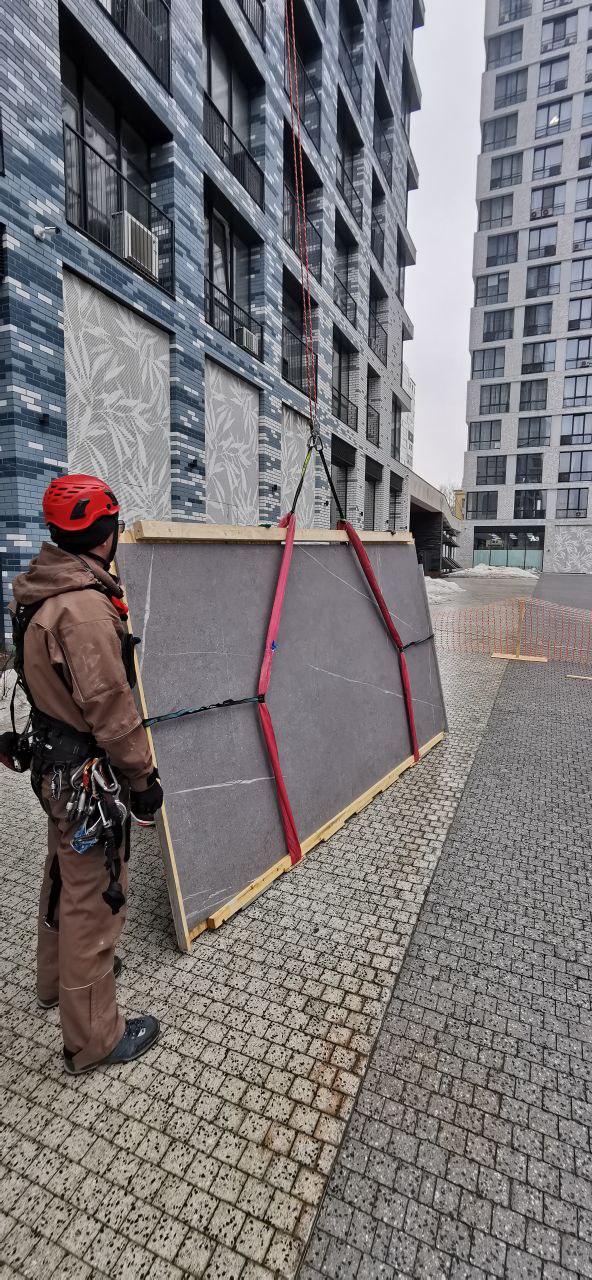 Команда промышленных альпинистов К5 успешно выполнила комплекс работ по подъёму и перемещению плит керамогранита для интерьерных решений в жилом комплексе «Кутузовский».